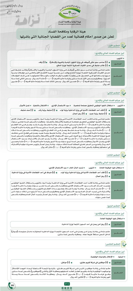 حكم ابتدائي بإدانة قائد أحد القطاعات الأمنية في وزارة الداخلية برتبة لواء بالتزوير واستغلال النفوذ الوظيفي وتبديد المال العام و سوء الاستعمال الإداري ومعاقبته بالسجن لمدة عشر سنوات وغرامة مالية قدرها 200.000 ريال.