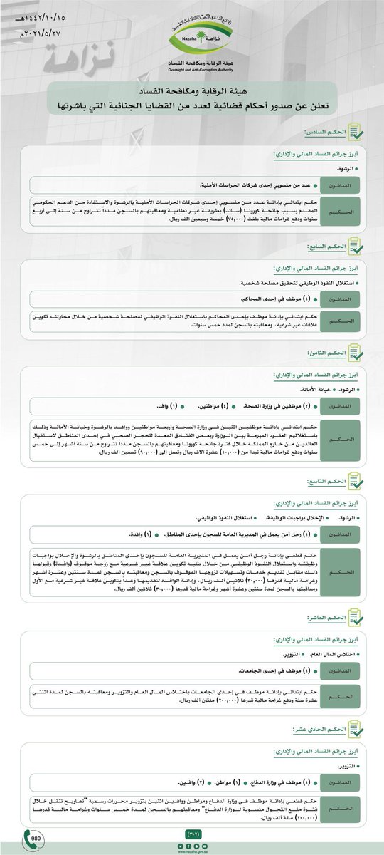 حكم ابتدائي بإدانة عدد من منسوبي إحدى شركات الحراسات الأمنية بالرشوة والاستفادة من الدعم الحكومي المقدم بسبب جائحة #كورونا (ساند) بطريقة غير نظامية ومعاقبتهم بالسجن مدداً تتراوح من سنة إلى 4 سنوات ودفع غرامات مالية بلغت 75.000 ريال.