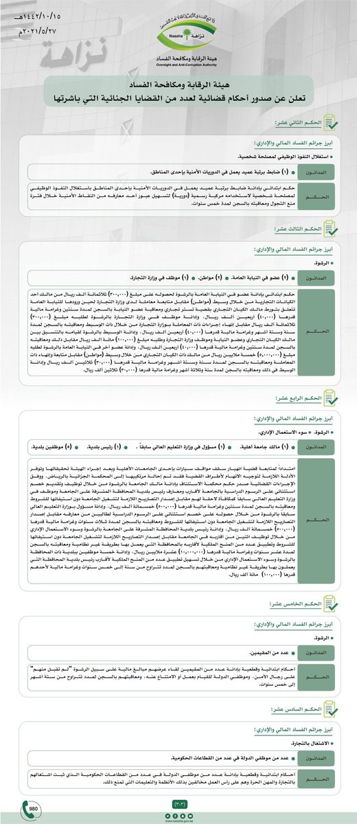 وإدانة رجل أعمال بالاشتراك بسوء الاستعمال الإداري وغسل الأموال ومعاقبته بالسجن 4 سنوات و6 أشهر وغرامة مالية قدرها 150.000ريال والمنع من السفر لخارج المملكة لمدة 3 سنوات، وإدانة رجل أعمال بتزوير محررات عرفية والاشتراك في استعمالها ومعاقبته بالسجن سنتين وغرامةماليةقدرها 200.000ريال