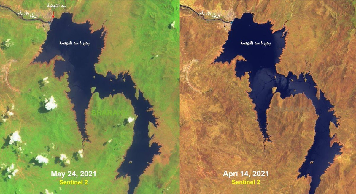 🔴ويؤكد عدم تغير منسوب الممر الأوسط هو ثبات حجم بحيرة السد بين 14 ابريل 2021 قبل فتح البوابتين وآخر صورة فى 4️⃣