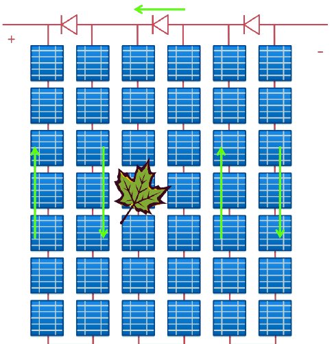 لكن عند حدوث ظل على أحد الخلايا تتوقف الخلية عن إنتاج جهد وتعمل وكأنها مقاومة مما يجعل حدوث voltage-drop فقد جهد وتعمل بقية الخلايا الغير معرضة للظل بمحاولة رفع جهدها لتعويض الخلية المتأثرة وتواصل بدفع التيار والذي سيمر بالخلية المتأثرة … يتبع