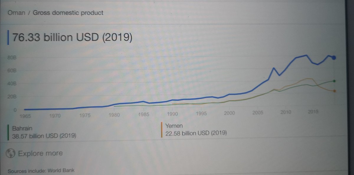 ومن المفارقات أن أعلى قيمة لمؤشر GDP وصلت له #عُمان كان في عز الأزمة التي ما زالت تعصف بالإقتصاد العماني ففي عام ٢٠١٨ كان GDP ٧٩.٧٩مليار بفارق بسيط عن أعلى معدل على الإطلاق في ٢٠١٤ حيث كان ٨٠.٦٩مليار، ورغم ذلك النمو في الناتج إلا أن الدين العام بدأ في التضاعف منذ ذلك الوقت