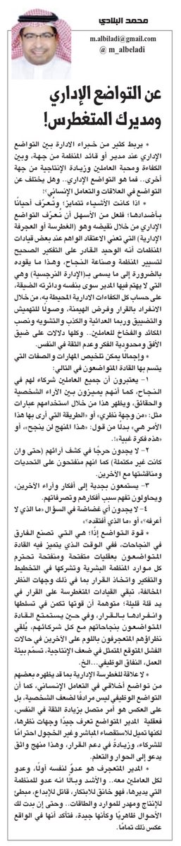 وفي حين يستمتع القادة المتواضعون بنجاحاتهم مع كل شركائهم وفرق عملهم ، يُلقي نظراؤهم المتعجرفون باللوم على الآخرين في حالات الفشل المتوقع المتمثل غالباً في ضعف الإنتاجية، تسمّم بيئة العمل، النفاق الوظيفي...الخ.