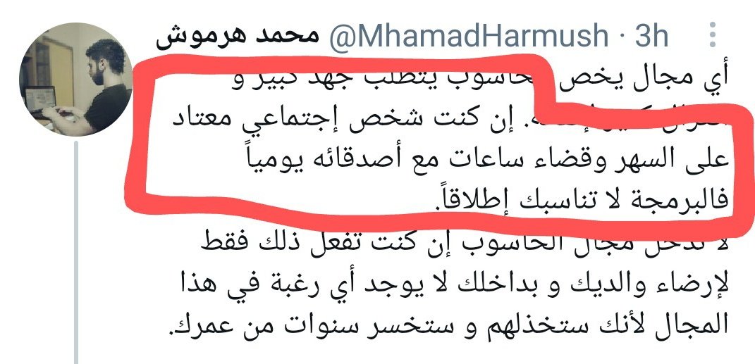 أي مجال يخص الحاسوب يتطلب جهد كبير و انعزال كثير لإتقانه. إن كنت شخص إجتماعي معتاد على السهر وقضاء ساعات مع أصدقائه يومياً فالبرمجة لا تناسبك إطلاقاً.