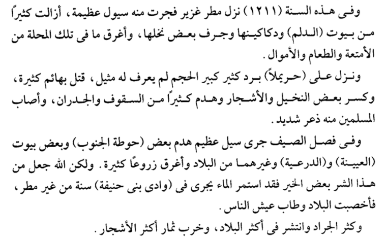 🔴أخبرنا ابن بشر في حوادث سنة 1224 (1809/07/13): أنه سالت شعاب: #العيينة #سدوس #حريملاء #الصفرة #ثادق #الحريق #الحوطة وسال #الخرج سيلاً غزيراً، وعم جميع نخيله، وعبرت حتى أن بعضهم أشفقوا على الحلل والمنازل من الخراب والغرق، وكذلك في #الأفلاج ، ووقع هذا السيل