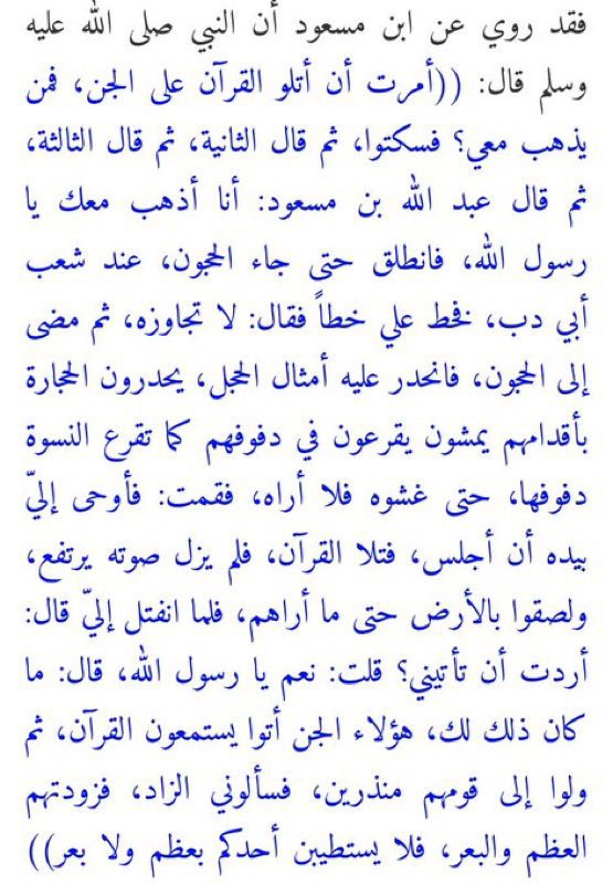 ثم قال النبي: هل رأيت شيئاً؟ قلت: نعم رأيت رجالاً سوداً مستثفري ثياب بيض، فقال: أولئك جن نصيبين، فسألوني الزاد، فزودتهم العظم والبعر، فلا يستطيبن أحدكم بعظم ولا بعر ( أي لا يأكل احدكم العظم ولا البعر ) ..