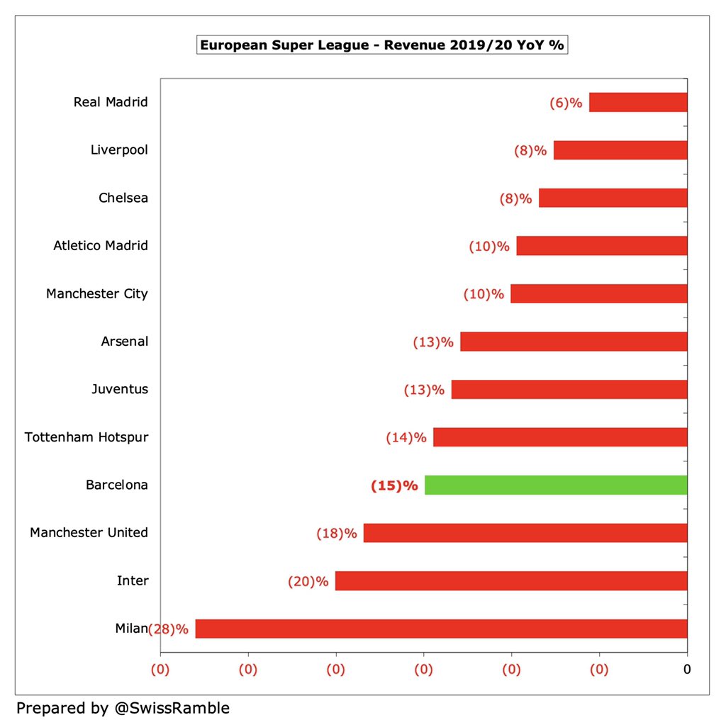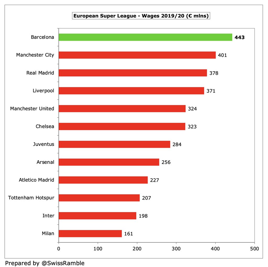 انخفضت أجور برشلونة (كرة القدم) بمقدار 58 مليون يورو (12٪) من 501 مليون يورو إلى 443 مليون يورو في 2019/20، لكنها لا تزال تنمو بنسبة 30٪ (103 مليون يورو) في 3 سنوات.