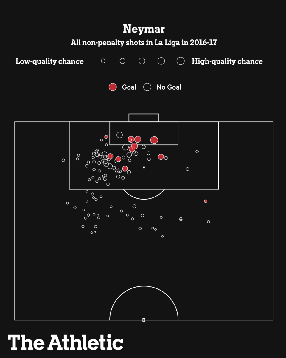 كما أن معدل تسديد اللاعب الأرجنتيني أعلى بشكل ملحوظ من زميله الذي سيصبح قريبًا ، مما يدل على أنه إما يسدد أو يخلق فرصة بقدر أكبر من اللمسات ، مع ميل نيمار إلى اللعب بالكرة دون فعل اي شيء لتتويج جهوده.