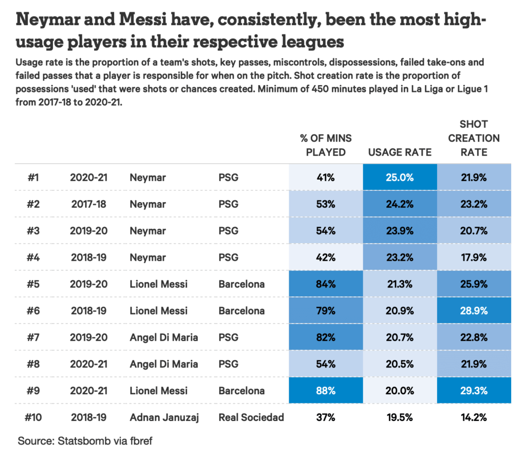 "استخدام" اللاعب - مقدار استخدامهم لامتلاك الفريق من حيث التسجيل أو إنشاء الكرة أو تحويلها إلى الخصم - هو مفهوم نشأ أولاً من عالم تحليل كرة السلة ، وهو بمثابة طريقة مفيدة تحليل ما إذا كان يمكن لميسي ونيمار اللعب معًا مرة أخرى.