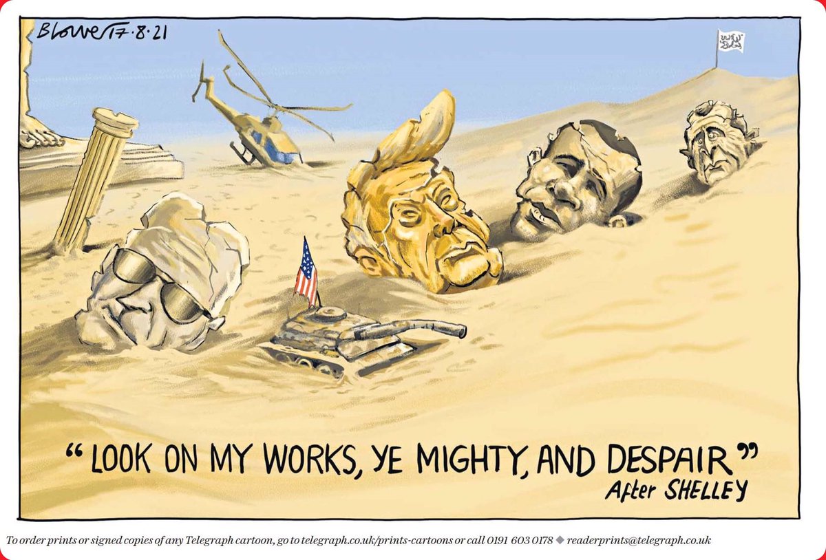 واقترن المقال بكاريكاتير يصور غرق الرؤساء الأربعة والقوة الأمريكية في رمال أفغانستان .