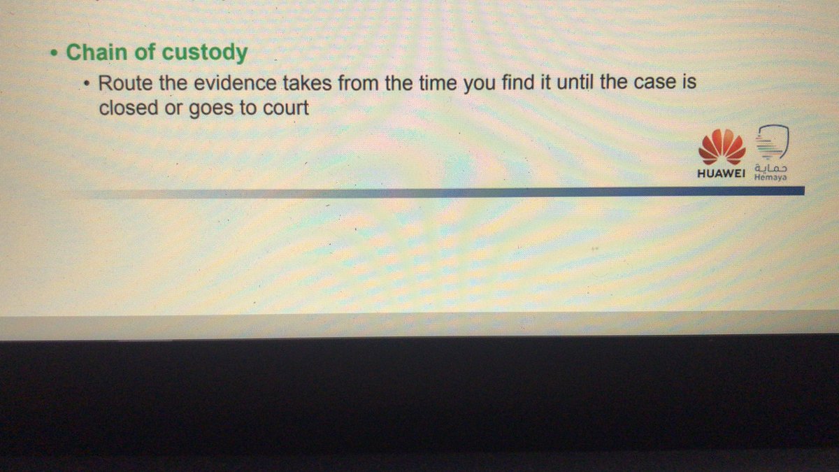 ومن المفاهيم المهمة جداً في عملية التحقيق هي (سلسلة العهدة)، مع أنني لا أحبذ التعريب للمصطلحات أبداً، ولكن لتقريب الفهم للجميع، وهي عملية حفظ الأدلة من لحظة استلامها، حتى انتهاء القضية وتسليمها للجهات المختصة، وحمايتها بأدق التفاصيل.