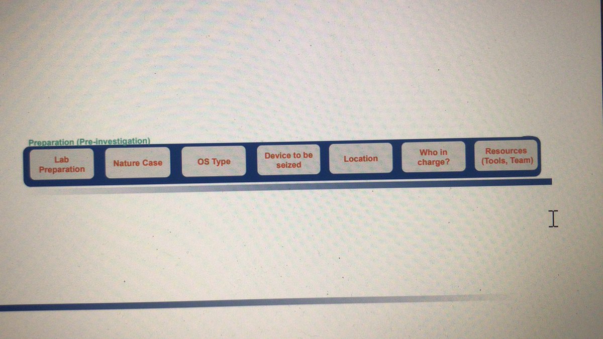 ونقوم فيها بالحفاظ على الأدلة وتأمينها أثناء العمل معها وأثناء نقلها بحيث إذا كان هناك اتصال بالانترنت على أحد الإجهزة لابد من اغلاقه ونلتقط صوراً لكل مسرح الجريمة تصويراً شاملاً دقيقاً حتى تصوير الاسلاك بكل جهاز.