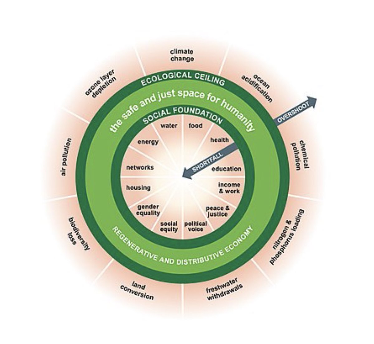 تم اقتراح إطار العمل للنظر في أداء الاقتصاد من خلال مدى تلبية احتياجات الناس دون تجاوز السقف البيئي للأرض. والهدف الرئيس للنموذج الجديد هو إعادة صياغة المشاكل الاقتصادية ووضع أهداف جديدة.