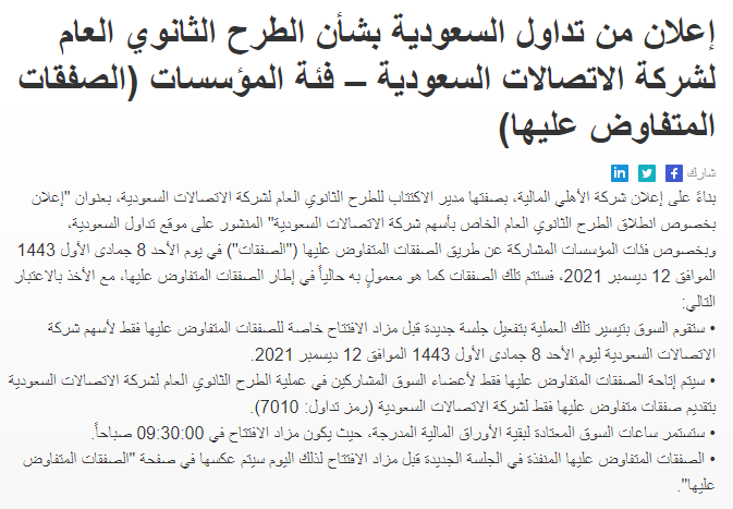 تحديد سعر الطرح العام الثانوي لشركة الإتصالات السعودية إس تي سي عند 100 ريالا للسهم الواحد.