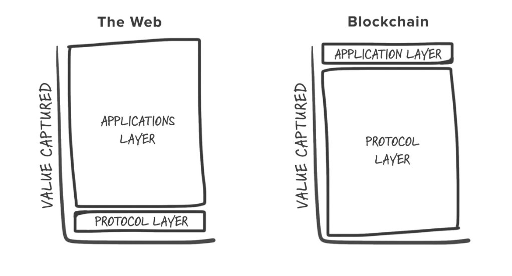 لكن تكنولوجيا البلوكتشين المفتوحة عكست هذا المفهوم وجعلت من الضروري لأي شخص يرغب بإستخدام التطبيقات غير المركزية أن يمر أولاً بالبلوكتشين نفسها. أي أنك إن أردت أن تستخدم تطبيق Uniswap في الإيثيريوم فعليك أن تدفع مقدار من الإيثر للبروتوكول (للمعدنين وغيره) لكي تصل للتطبيق (يتبع)
