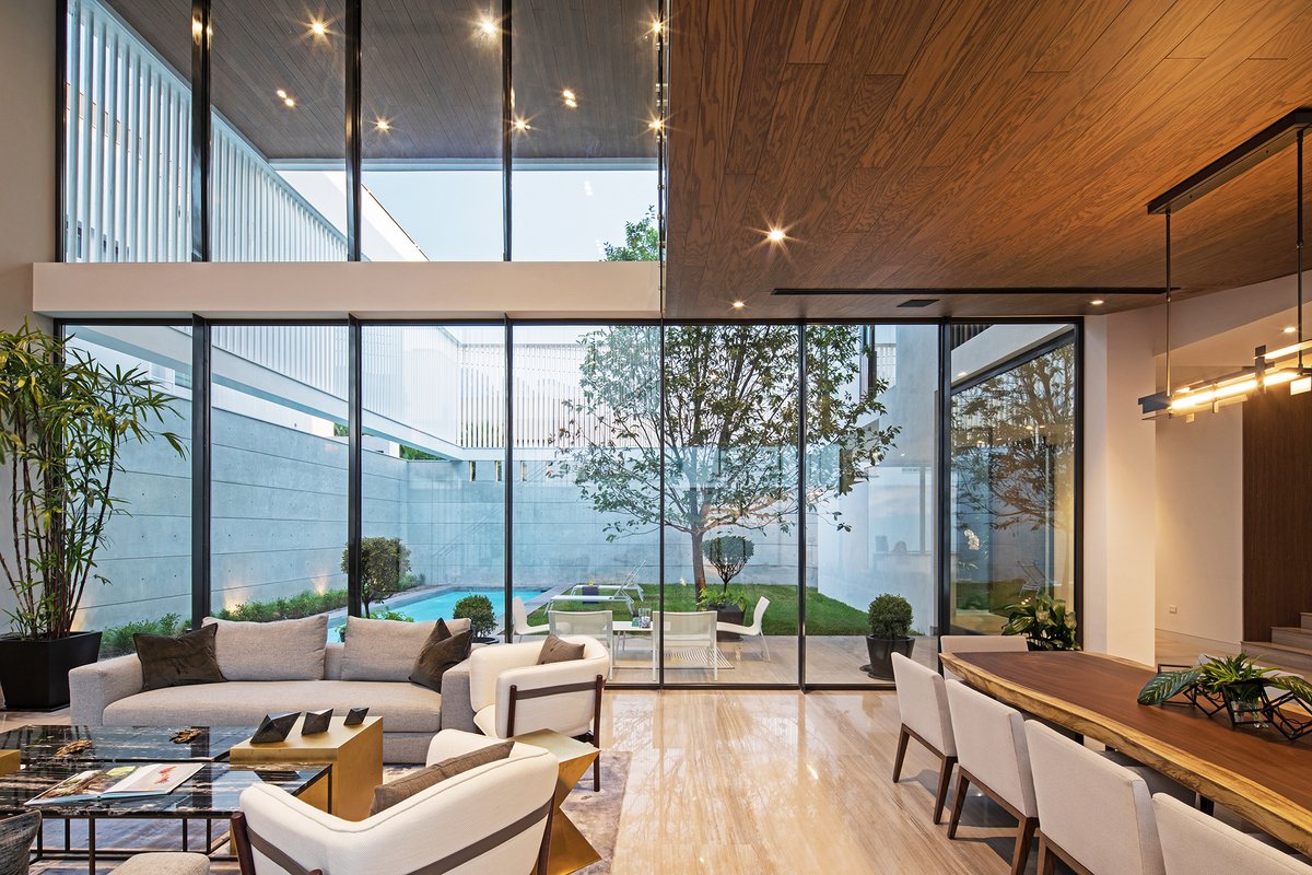 وهنا ترى يا عزيزي صالة الجلوس واتصالها القوي على الفناء الخلفي والأمامي لينتج لك امتداد بصري لا يحده إلا حدود ملكيتك ,,,