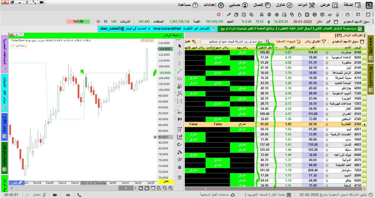 كذلك تم اضافة قائمة الترقب لاختراق شممعة الرادار تعطيك السهم لمجرد دخوله في ادنى شمعة الرادار كما هو واضح على بي سي اي واسلاك وانابيب السعوديه وكذلك الجزيره ريت مع كتابة سعر الدخول في الاختراق