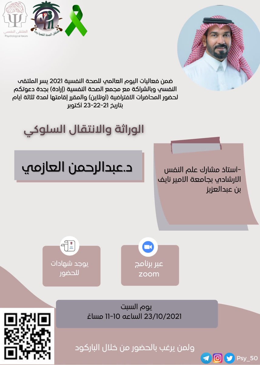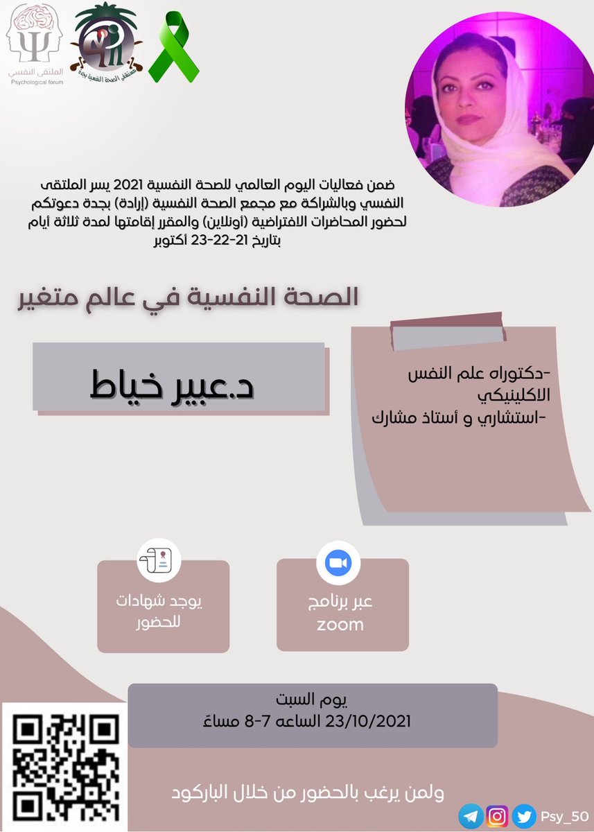 دعوتكم للتسجيل بالمحاضرات الافتراضية التي ستقام (أونلاين) وذلك يوم الخميس والجمعة والسبت 21-22-23 اكتوبر.