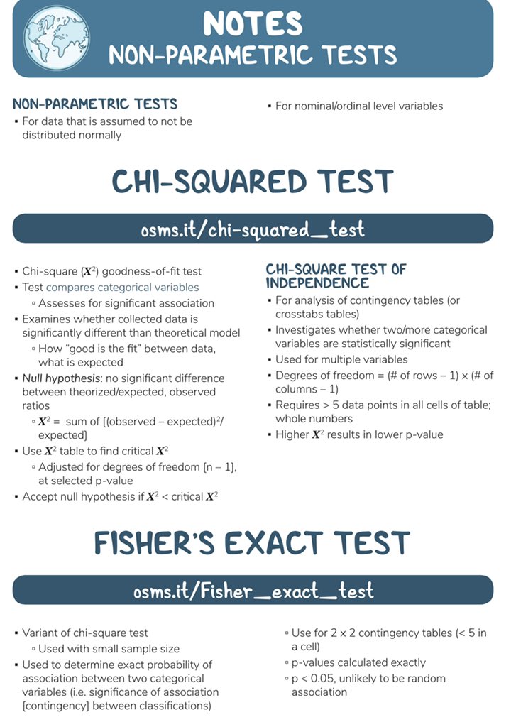 🔸يستخدم اختبار fisher مع العينات الصغيرة حيث يعطي نتائج أدق من إختبار مربع كاي Chi2 (عندما تكون احدى الخلايا المتوقعه اقل من ٥, او مجموع العينة اقل من ٣٠)