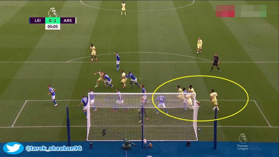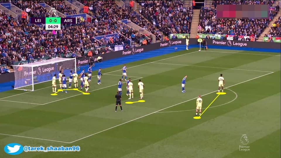 أرسنال سجلوا هدفهم الأول في ليستر سيتي من ضربة ركنية فيها عمل تكتيكي منظم يهدف إلى خلق مساحة معينة في دفاع ليستر وتحرير أهم لاعبي أرسنال في ألعاب الهواء من الرقابة الفردية..