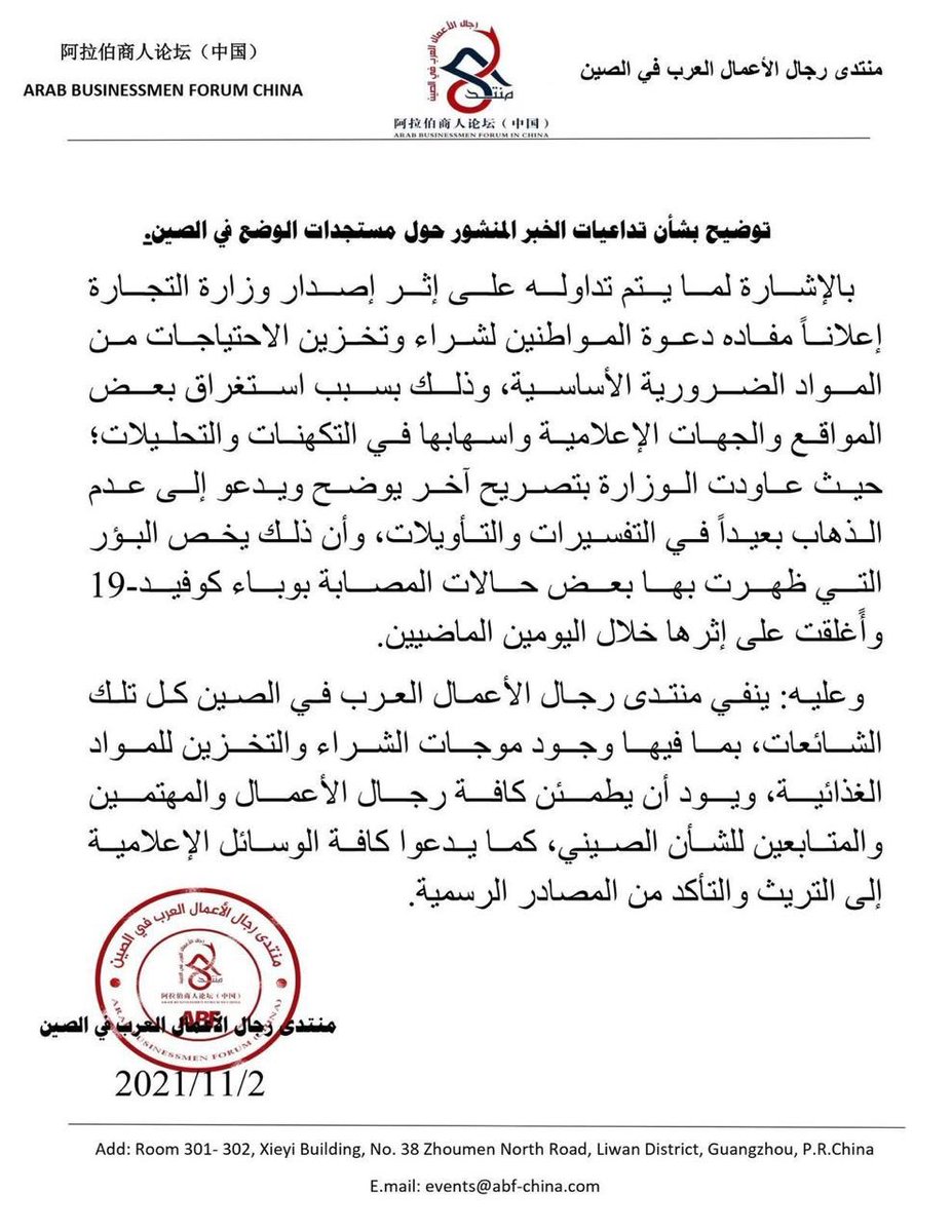 مرفق فيما يلي بيان منتدى رجال الأعمال العرب في الصّين