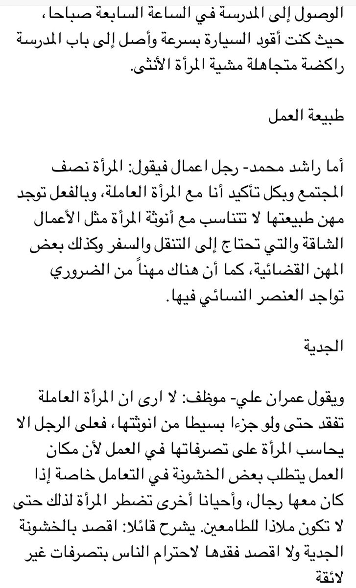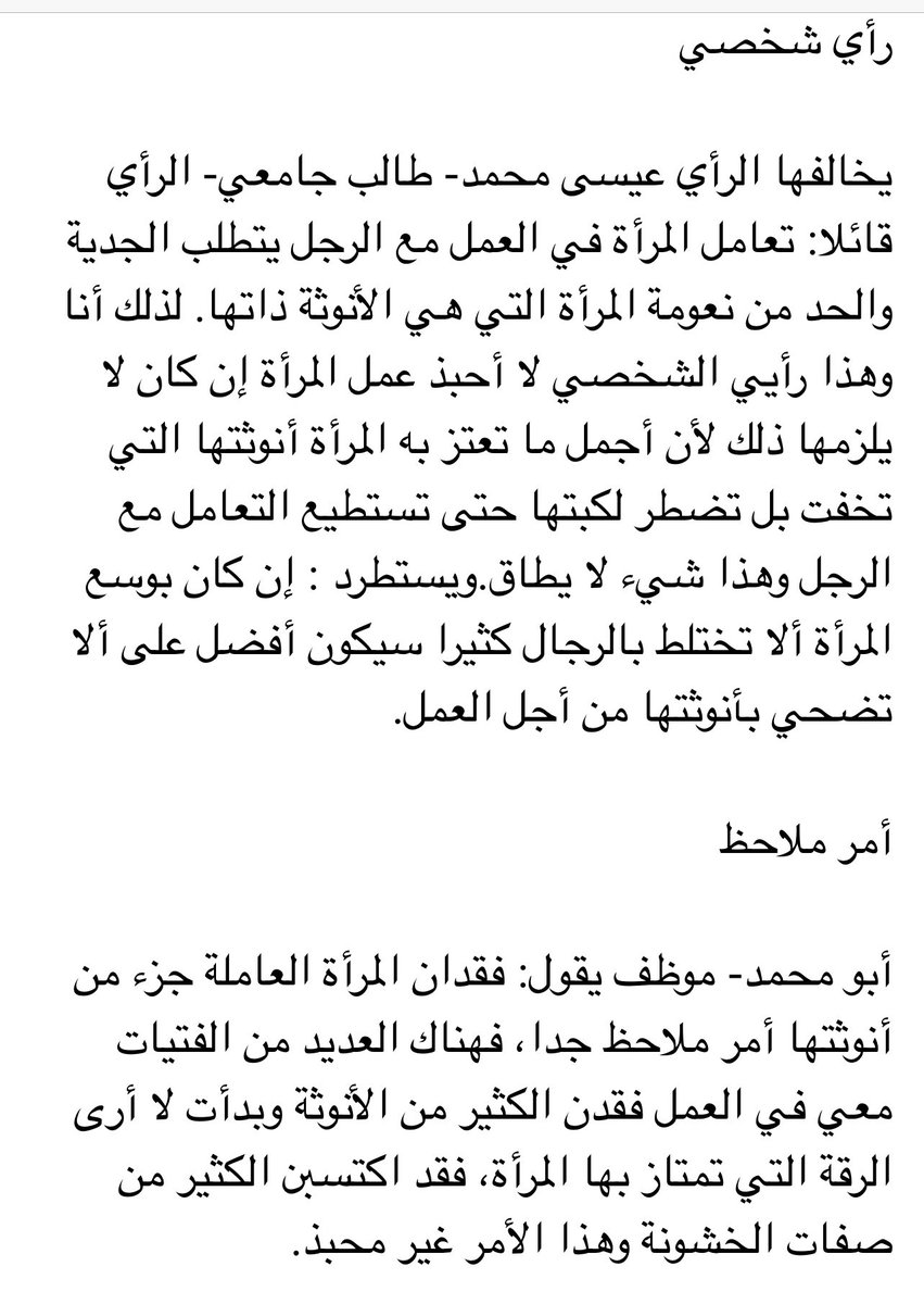 نقاش وحوار حصل بصحيفة البيان، خلاصته المرأة العاملة وبالذات مع الرجال تكتسب خشونةً،