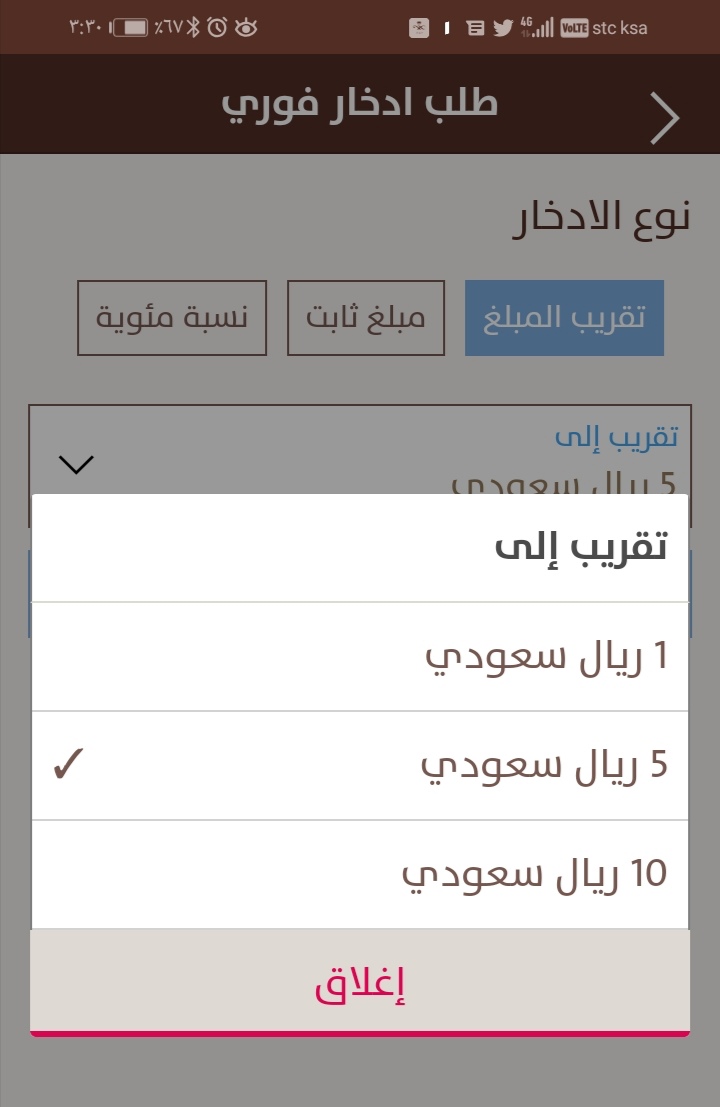 بمعنى.. فرضاً لو اخترت التقريب إلى أقرب ٥ريال يعني لو اشتريت بِـ ٣٨ريال.. يكون الباقي على أقرب ٥ هو ريالين.. فيتم تحويل ريالين من حسابك الجاري لحسابك الادخاري