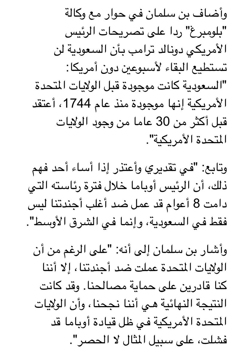 جزء من تصريح صاحب السمو الملكي ولي العهد السعودي سمو الأمير / محمد بن سلمان بن عبدالعزيز آل سعود حفظه الله أن أميركا أوباما عملت ضد السعودية .. ولكن السعودية نجحت .. وأميركا فشلت .. 👇🏿😎
