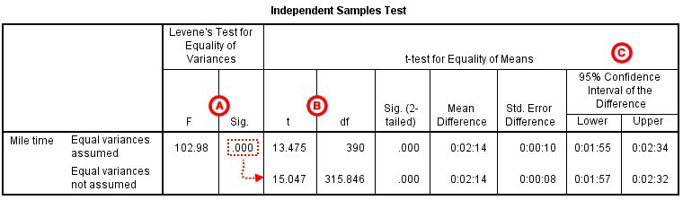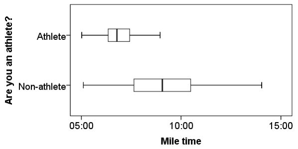 There was a significant difference in mean mile time between non-athletes and athletes (p < .001). The average mile time for athletes was 2 minutes and 14 seconds faster 95%CI (1:57 -2:32) than the average mile time for non-athletes.