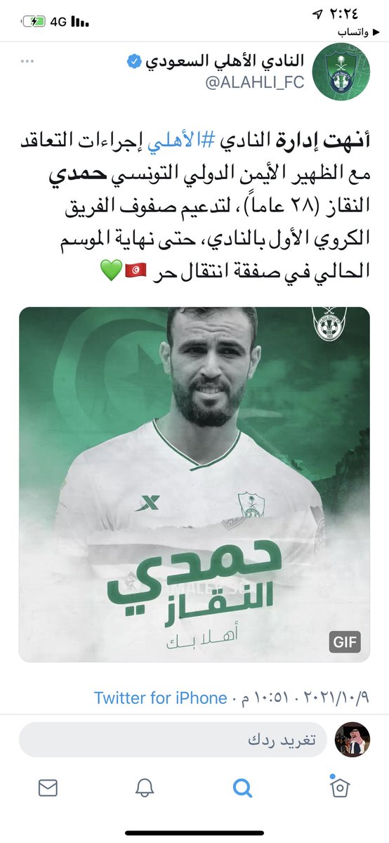 رابعاً/في ٩ / ١٠ / ٢٠٢١ أعلن #الأهلي عبر بيان اعلامي منشور في حساب النادي بتويتر عن التوقيع مع اللاعب #حمدي_النقاز عقد احترافي في صفقة (انتقال حر)