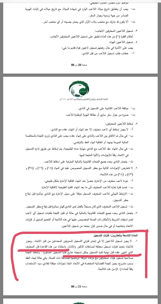 ٢- للسماح لأي فريق بتسجيل لاعب محترف خارج فترة التسجيل يجب تحقق أحد شروط المادة ٢٩ من #لائحة_الاحتراف: