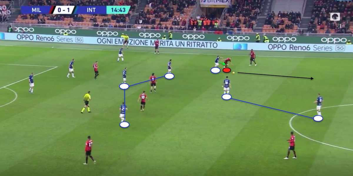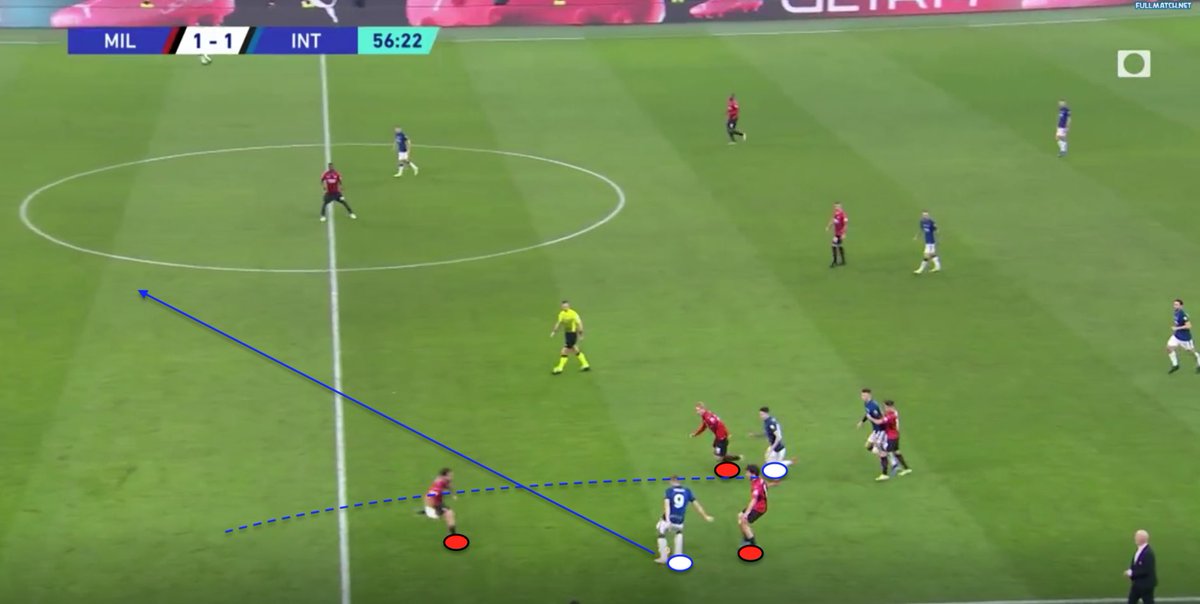 AC Milan’s first line of pressure has also been destroyed by Dzeko’s deep drop offs. Bastoni participated to these passing schemes and Calabria manmarked with laxism his teammate in National team. Numerical superiority has been created subsequently.