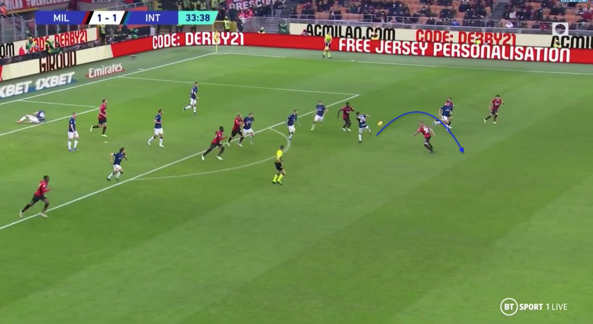 As lanes are bottled, Leao had an interesting to use Ballo’s position to curve his run and adress and marvelous ball to Diaz, but Krunic made a questionable move and blocked the pass. Inter’s defense was dislocated (thanks to Zlatan)