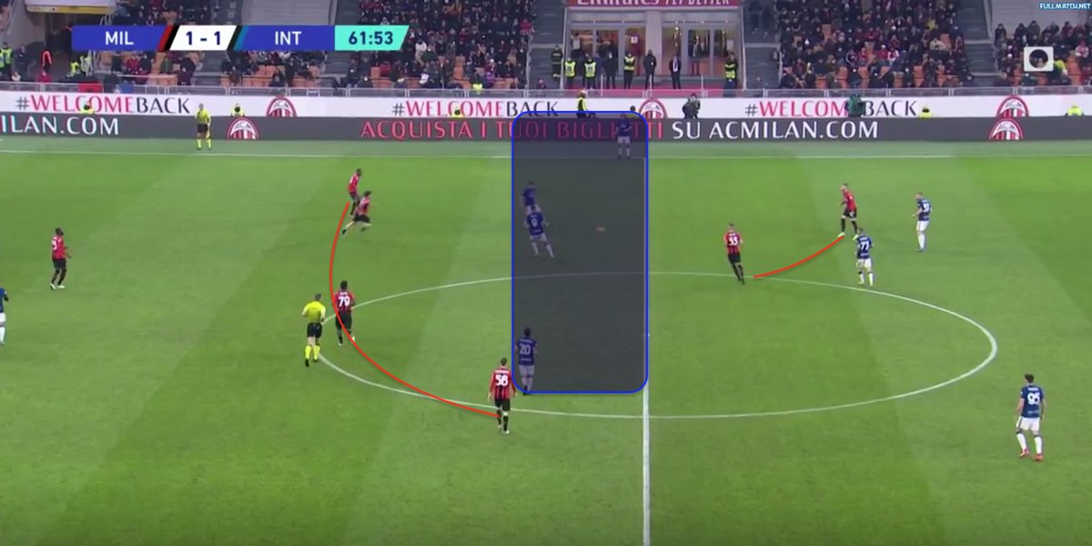 As Milan’s double pivot remains relatively high, and Krunic letting Brozovic away, Inter can switch game zone (in case of low build up) easily, by using width.
