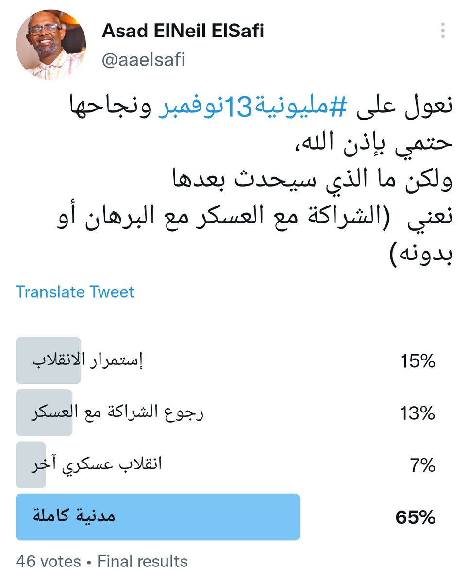 نعم،، #مليونية13نوفمبر هدفها أبر وأسمى وهو #بناء_الدولة_السودانية،، وإنما إزاحة البرهان و أعوانه في #الانقلاب_العسكري بسند #الأخوان_المسلمين هي أولى المحطات.. وعودة الحياة المدنية وبناء المؤسسات الدستورية هي مجرد محطات لبلوغ غاية أسمى سيصنعها هذا الجيل.. وسيسابق عليها الزمن.