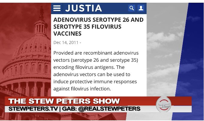 براءة الاختراع الأمريكية 201417278 وهو الفيروس الغدي 26 و 35 هذه اللقاحات تعمل على ترميز خليتك بسبايك بروتينات الإيبولا وماربورغ. إنه في لقاح جونسون لذا فإن هذه اللقاحات تزيل الجينات E1 ، E3 و E4.