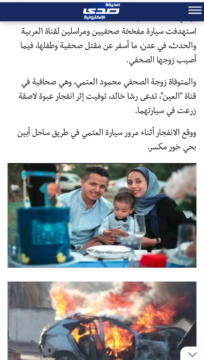 وقبل اسبوعين نوفمبر 2021 , في #عدن #اليمن، اُستهدف مراسل #العربية #محمود_العتمي، وزوجته الحامل الاعلامية #رشا_خالد، التي قتلت نتيجة انفجار قنبلة لاصقة زرعت في سيارته واصيب هو اصابة بالغة #يوم_التلفزبون_العالمي