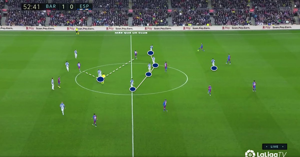Again : ball dominance for Barca’s CBs to initiate build-up, which was facilitated by the low positioning from Espanyol’s line. R. De Tomas alone, he can’t manmark Busquets, and midfielders didn’t accompany him.