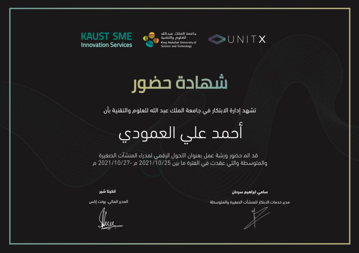 🎓 بفضل الله حصلت على شهادة من جامعة الملك عبدالله للعلوم والتقنية #كاوست في ختام برنامج #التحول_الرقمي لمدراء المنشآت الصغيرة و المتوسطة، بتنظيم إدارة خدمات الابتكار للمنشآت الصغيرة و المتوسطة على مدى ثلاثة أيام ثرية بالمعلومات التقنية والنماذج الجديدة وأفضل المارسات.