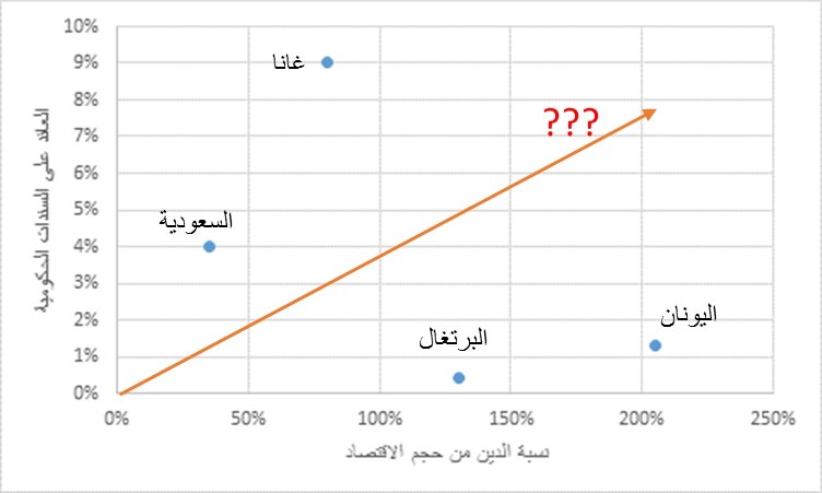 3. جزء من هذا يمكن تعليله بأن غانا دولة فقيرة مقارنة بالبقية. ولكن ذلك لا يفسر موقع السعودية والذي أيضا من المفروض أن تدفع معدل فائدة أقل من اليونان والبرتغال لأن نسبة ديونها أقل.