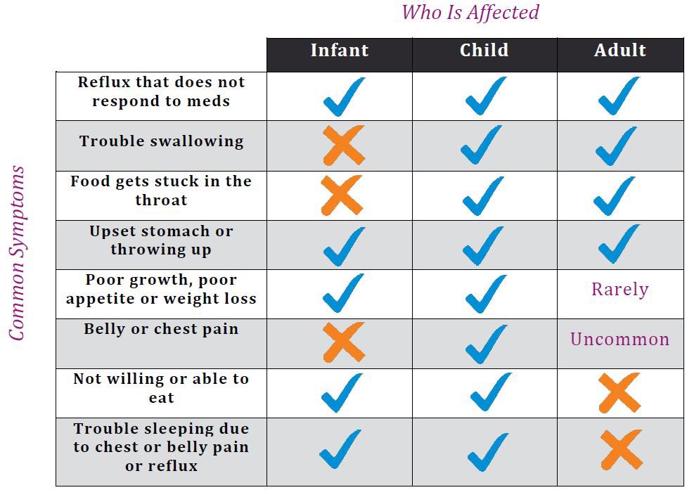 يتم تشخيص الحالة بواسطة منظار المريء الذي عادة ما يظهر تغير في جداره متمثل في وجود حلقات و شقوق في الطبقة السطحية مع ضيق في قطره كما هو موضح في الصورة. تأخذ عينات من جدار المريء و التي عادة ما تظهر زيادة ملحوظة في عدد خلايا #eosinophils