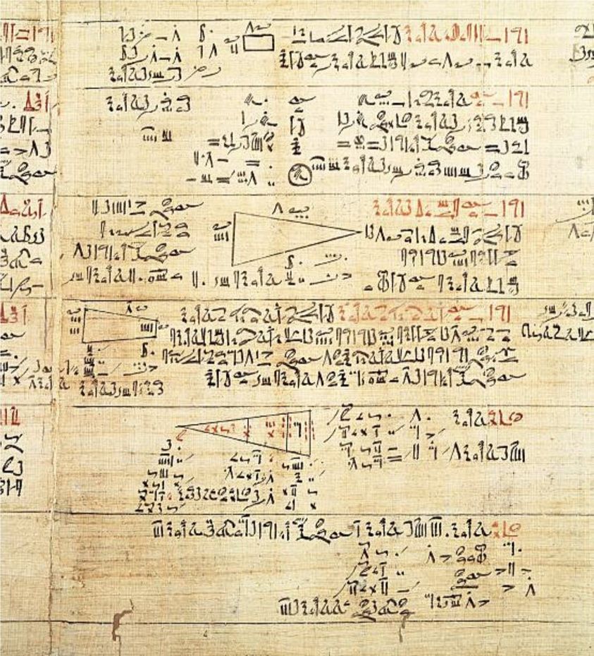 من بردية تانية أصلية أقدم منها، بيتكلم فيها إنه فيه مشاكل (إللي هي بلغتنا دلوقت) معادلات بتواجهم ومحتاجين يفهموها ويحلوها!دي معادلات قسمة، ضرب، كسور وأرقام عشرية،حساب المساحات والاحجام!