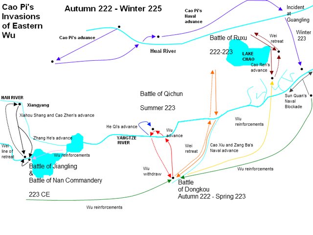 في عام 217 ، قاد Cao Cao جيش جرار قوامه 400 الف جندي . لغزو Ruxu ومن ثم غزو Wu بأكملها ردًا على هجوم سون تشوان على Hefei في عام 215.