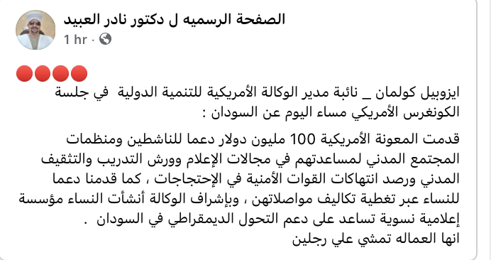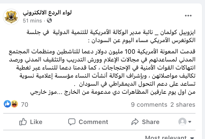 ....للمستهلك على وسائل التواصل الاجتماعي لإيصال رسالة واحدة وهي أن المظاهرات التي تخرج في السودان مدفوعة من امريكا وليست شعبية عفوية وتمثل رغبات (معارضة ورفض الانقلابيين) الشعب السوداني الذي يتطلع لحكم ديمقراطي, مساواة وعدالة لكل السوداني/3