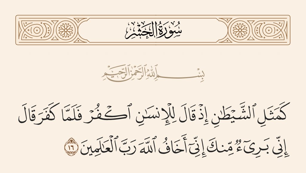 23/ والآية 16 من سورة الحشر يُقال بأنها نزلت في ذلك العابد #برصيصا للدلالة على مثال مما يفعله الشيطان للعبد بأن يحوّله من عابد إلى مُشرك ولنحذر من الشيطان الرجيم ...((كمَثل الشيطان إذ قال للإنسان أُكفُر فلما كفَر قال إني بريء منك إني أخاف الله رب العالمين))..تحياتي لحضراتكم ✅🔚