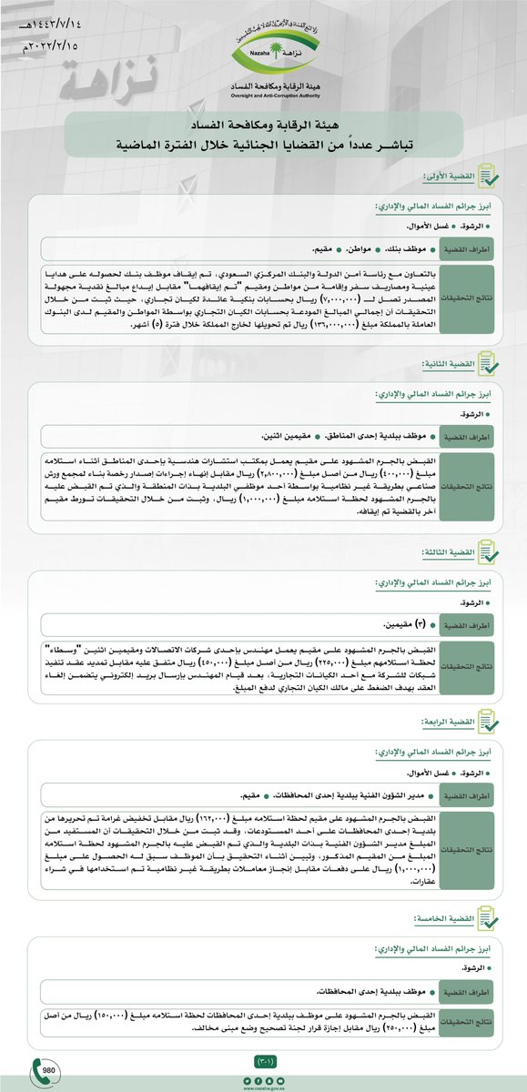صرَح مصدر مسؤول في هيئة الرقابة ومكافحة الفساد بأن الهيئة باشرت عدداً من القضايا الجنائية خلال الفترة الماضية، وجارٍ استكمال الإجراءات النظامية بحقهم. وكانت أبرز القضايا على النحو الآتي: