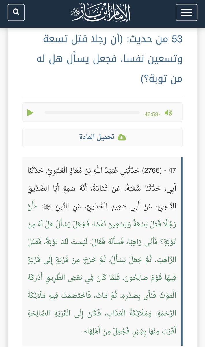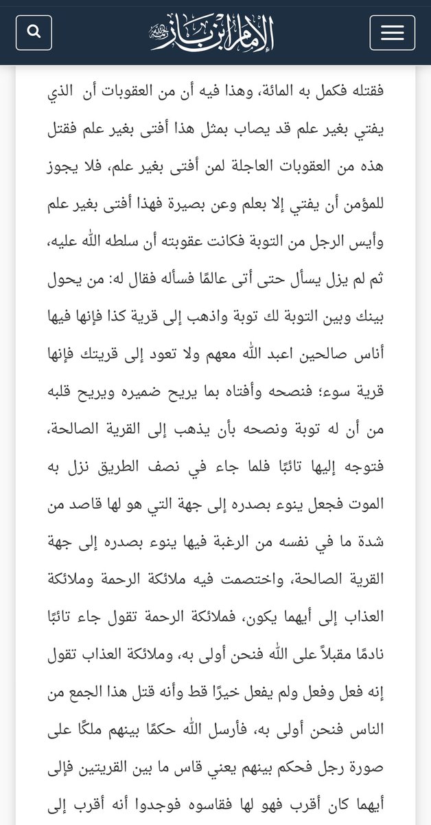 وذهب إلى عالم، وقال هل من توبة؟ قال ومن ذا الذي يحول بينك وبين الله؟ لك توبه، ولكن اذهب إلى قرية صالحة فإن هذه القرية فاسدة