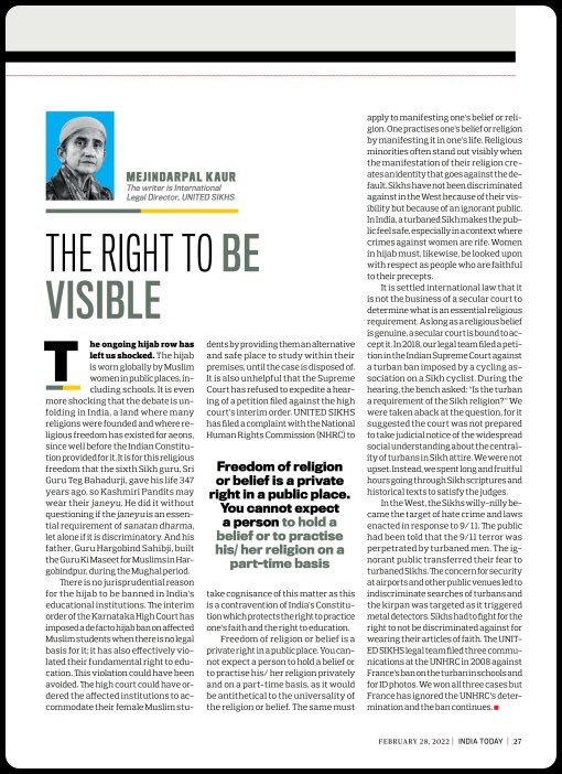 12.ضمن الملف وفي مقال " الحق في أن تكون مرئيا " كتبت "ميجينداربال كاور" مدير القانوني الدولي بمؤسسة السيخ المتحدون: