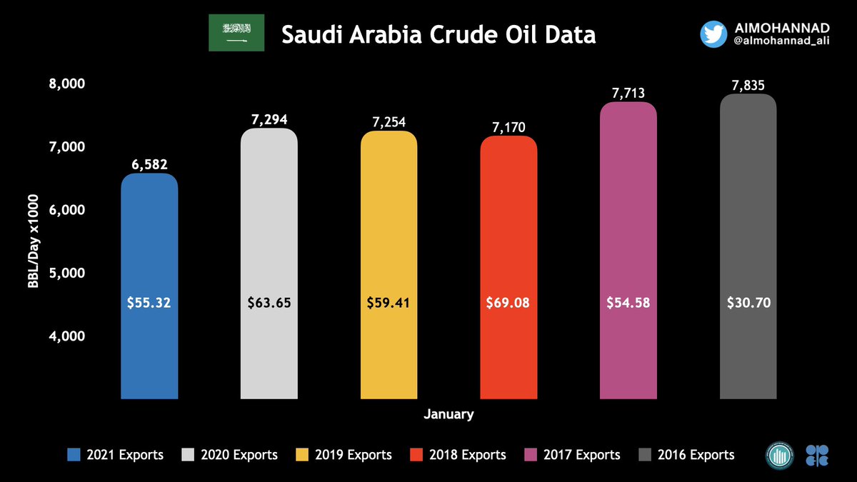 أرقام صادرات النفط الخام للمملكة العربية #السعودية لكل شهر مع متوسط سعر خام برينت القياسي $ للفترة من 2016 - 2021؛