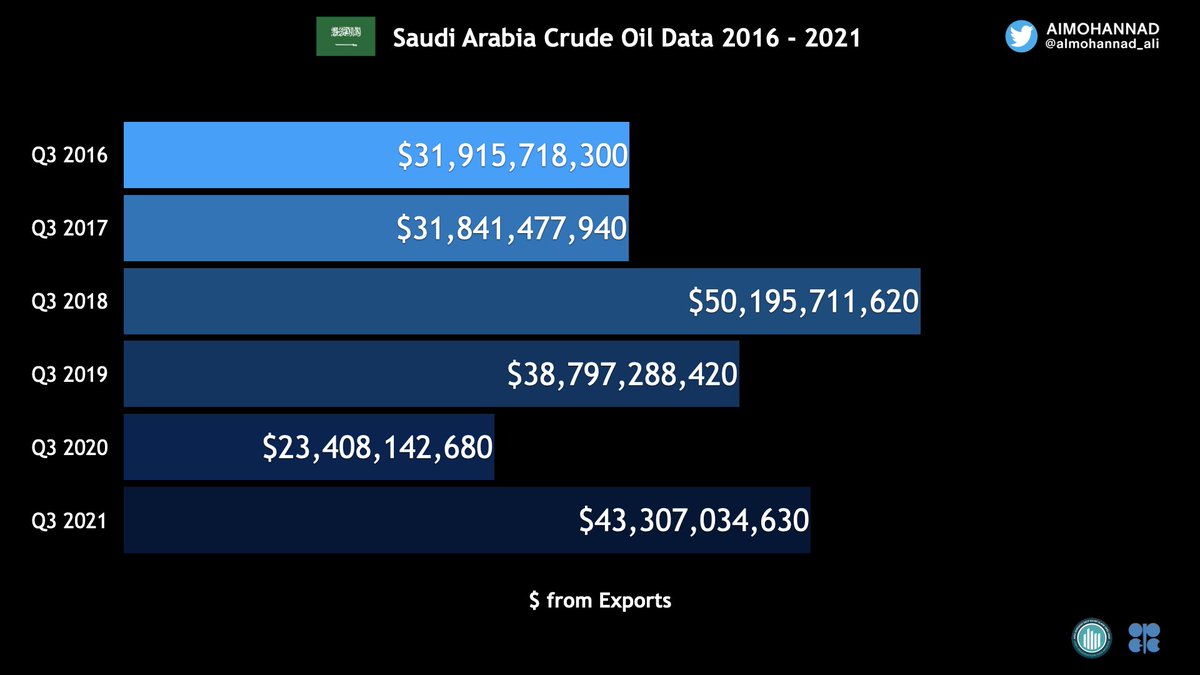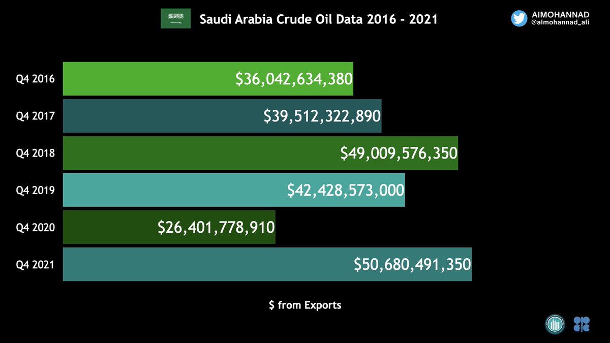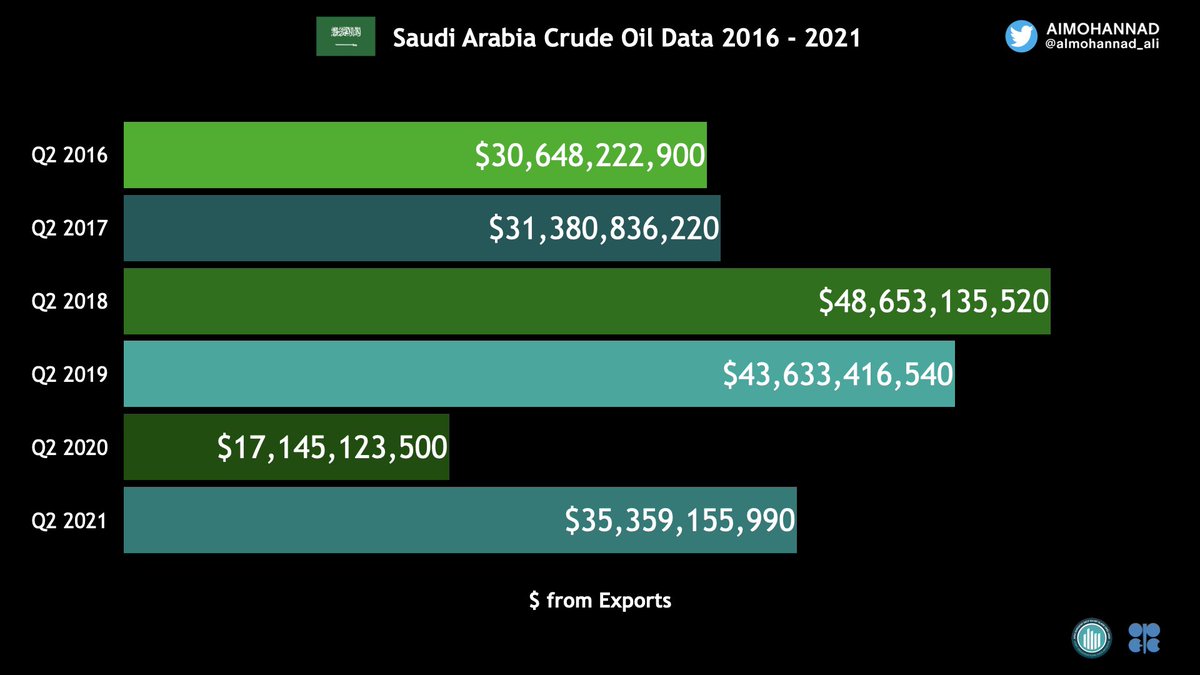 وهنا أرقام (تقديرية) لايرادات المملكة العربية #السعودية من صادراتها للنفط الخام لكل ربع للفترة من 2016 - 2021
